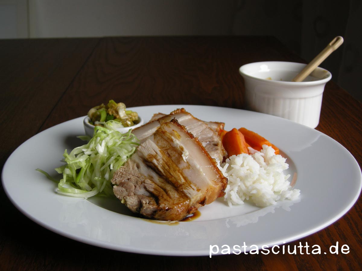 Oh mein Gott! Kreuzkümmel und Schweinebauch, da fehlt nur noch Koriander! Also ich werd das gaaaanz schnell ausprobieren. Da läuft mir nur so das Wasser im Mund zusammen. Endlich mal jemand, der weiß, welche Zutaten Geschmack bedeuten! (Auf den Reis kann man getrost verzichten…)