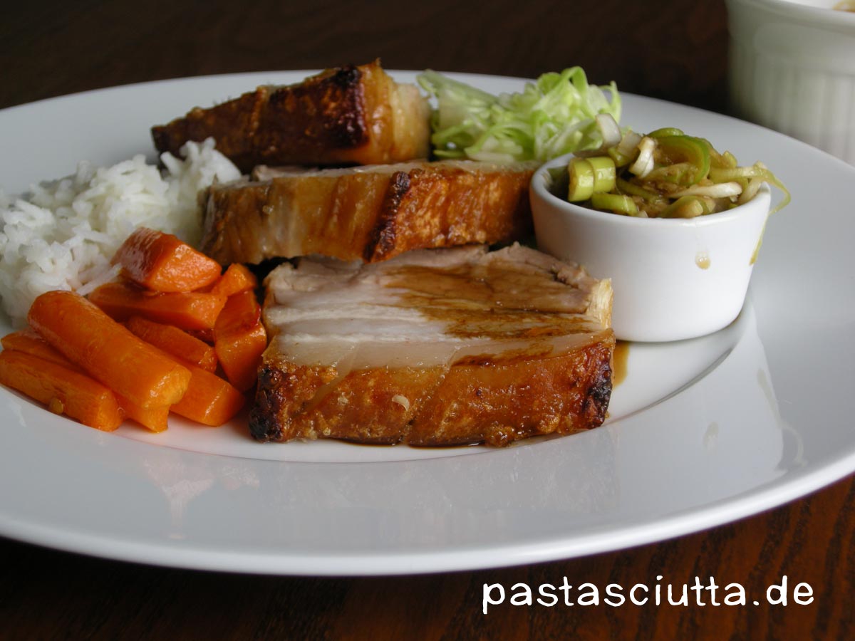 Die Anregung zu diesem Gericht entnahm ich dem Kochgesetzbuch von Christian Rach, der den Schweinebauch ganz ähnlich zubereitet.