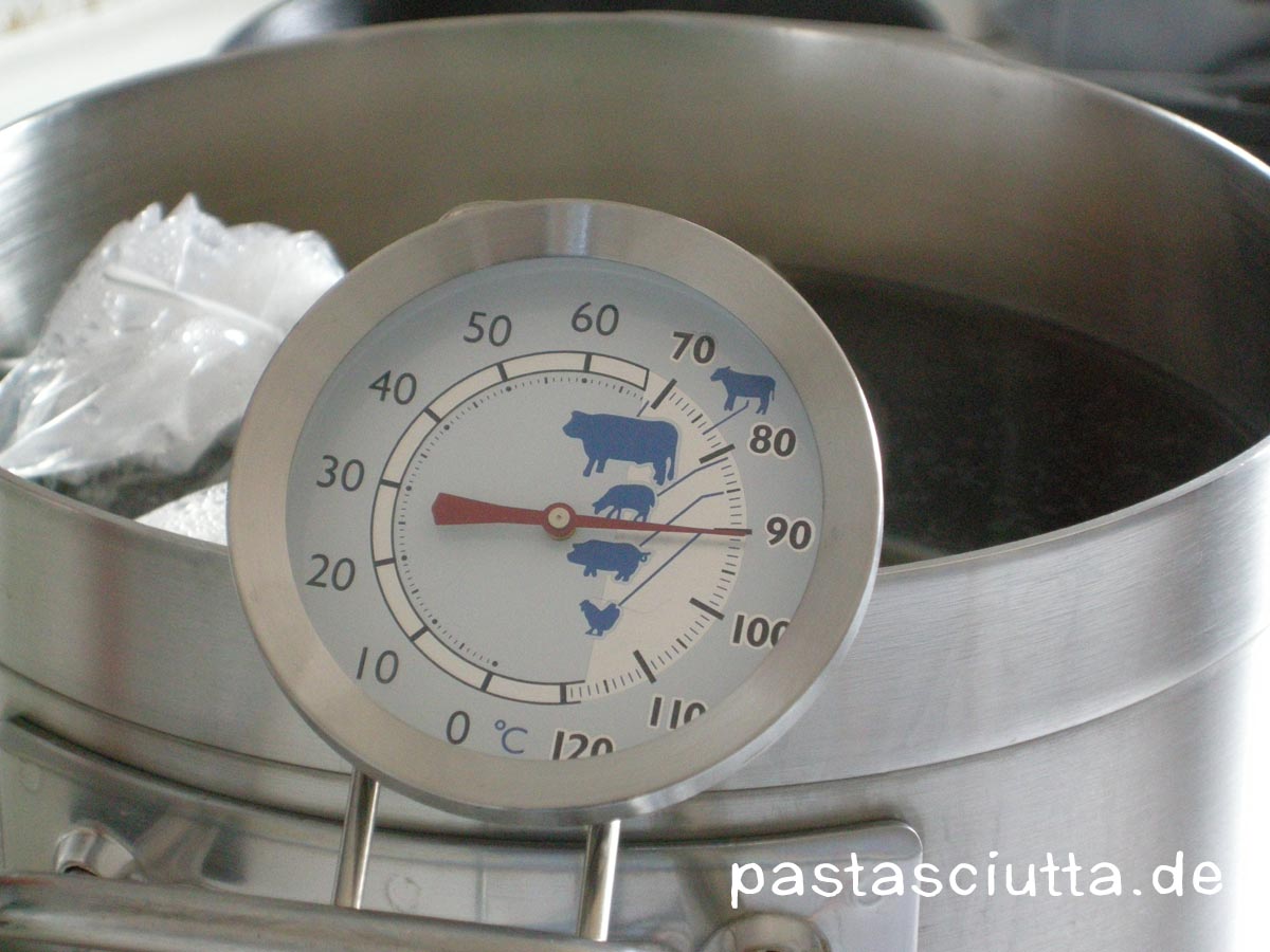 Dieses schöne Paket kommt für zwei Stunden in ein Wasserbad von 90°C. Als Pi-mal-Daumen Köchin hatte ich mir das exakte Steuern der Temperatur schwieriger vorgestellt. Tatsächlich ging es ganz einfach. Ab und zu war ein Schlückchen kaltes Wasser nötig, und dann blieb die Temperatur wieder recht lange konstant.